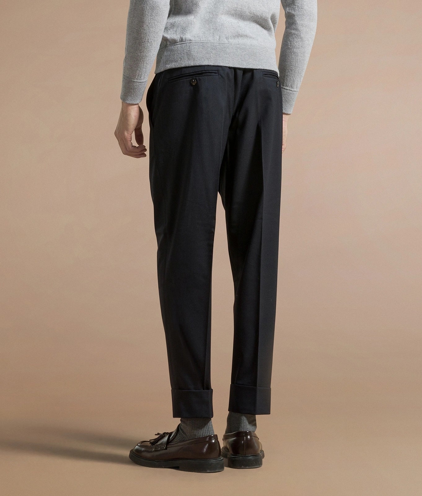 Tapered fit trousers with turn-ups, made from virgin wool flannel