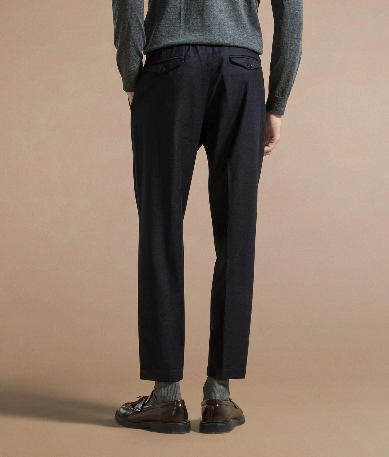 Tapered fit trousers with drawstring in stretch wool flanel