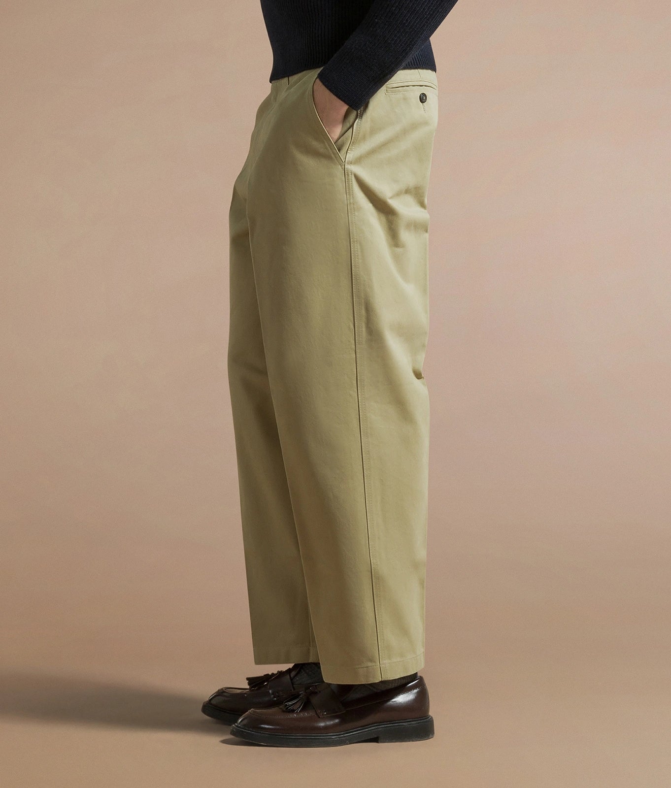Il nostro pantalone Mitte è il modello più iconico tra i pantaloni carrot e pantaloni tapered fit, mentre il modello Burano, caratterizzato da una vestibilità più ampia, è un pantalone loose fit fluido e decostruito.