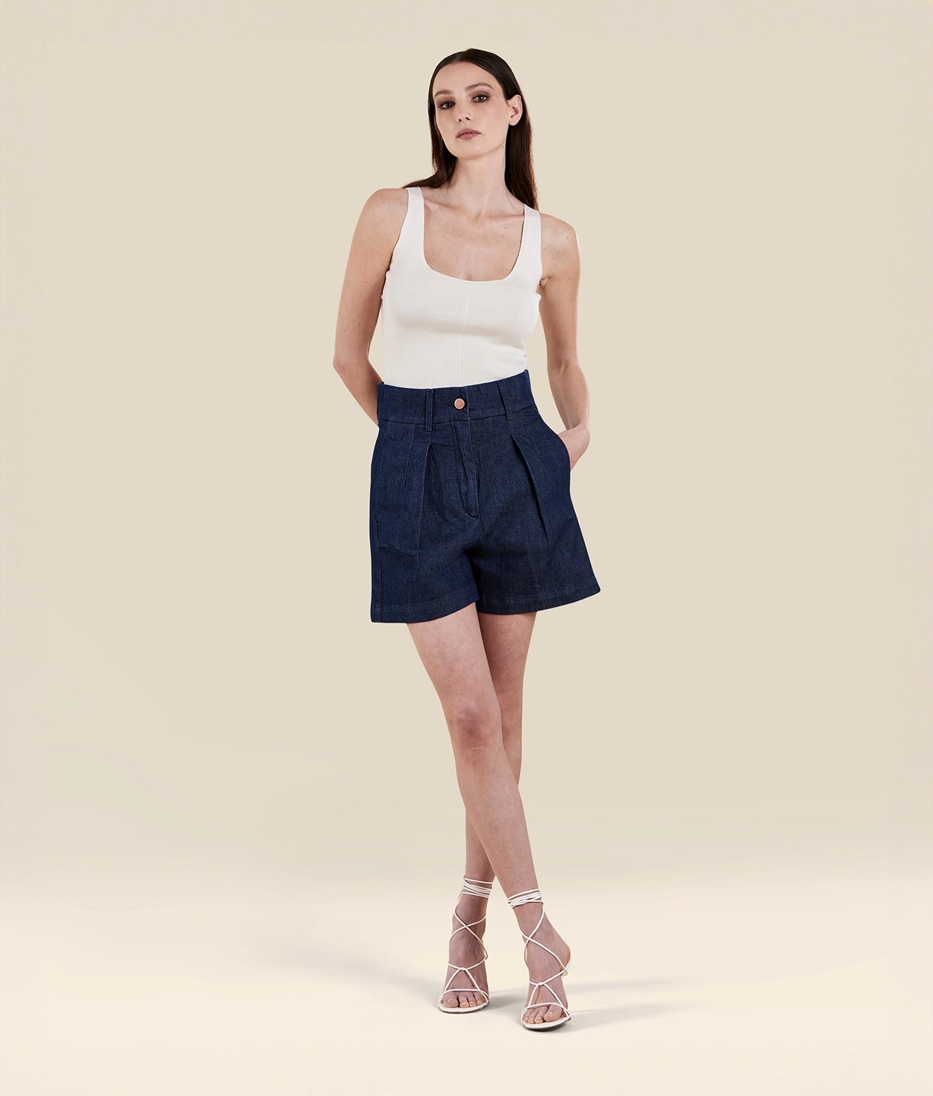 Shorts with double pleats in natural stretch denim