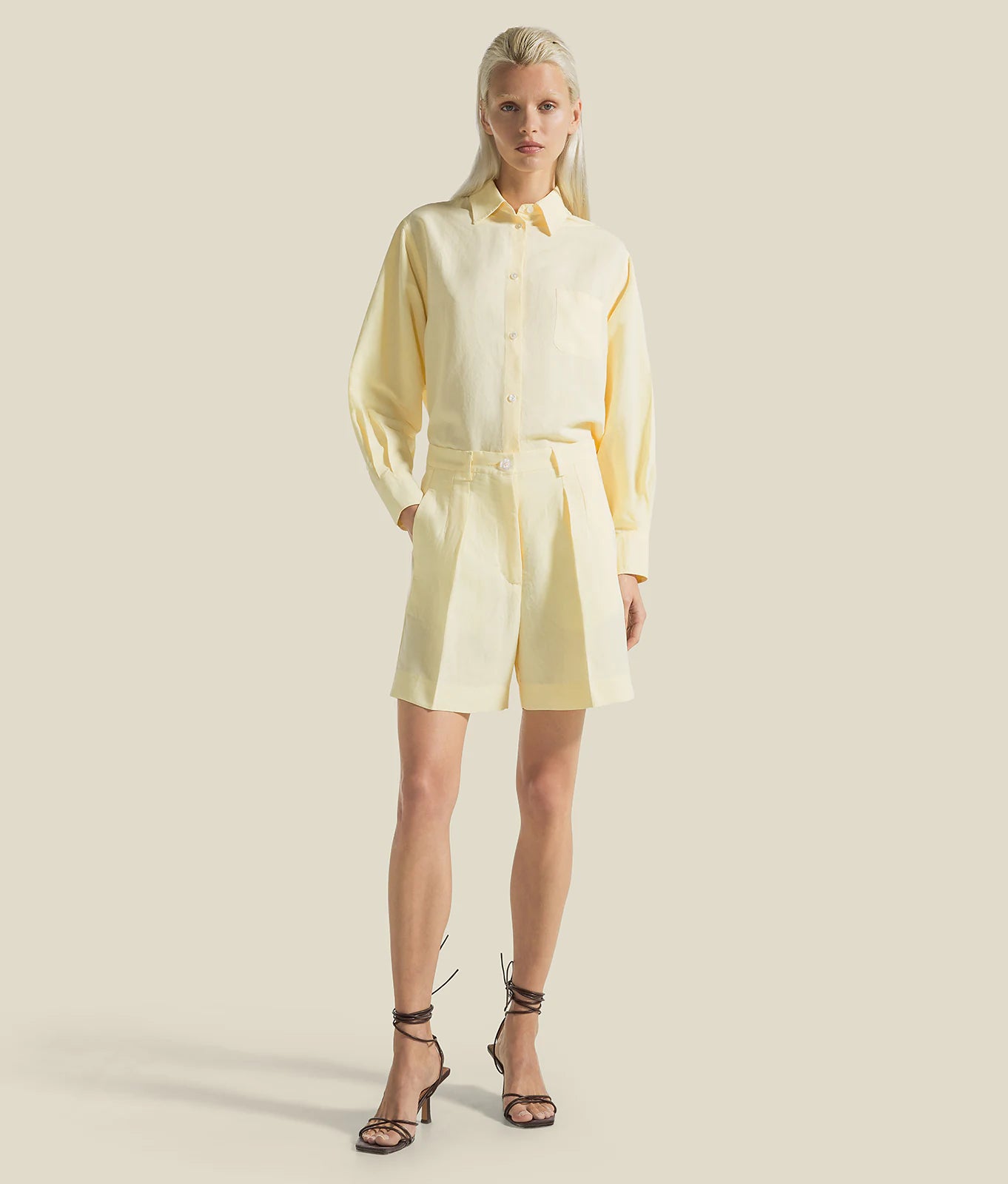 Viscose-linen blend double-pleated shorts