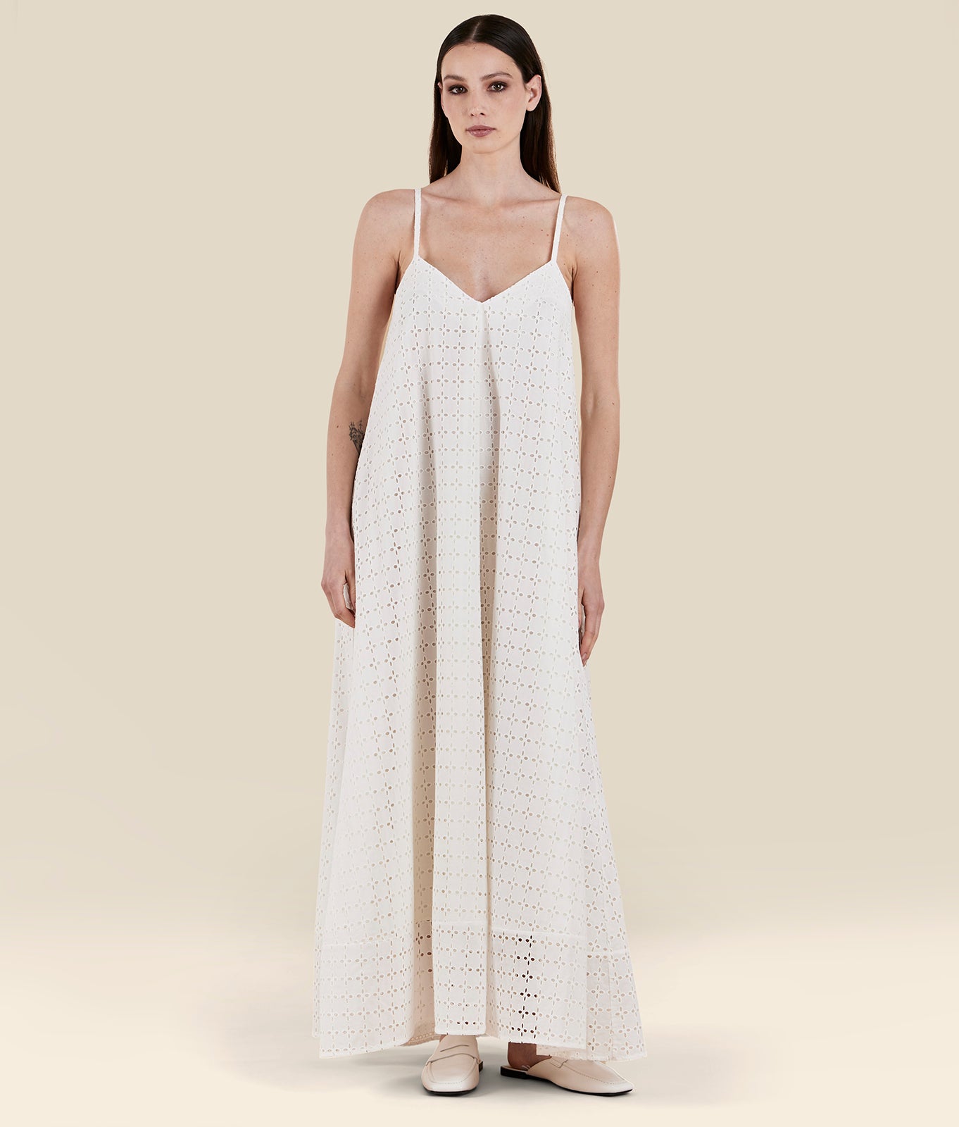 Long, loose-fitting dress with thin straps in Sangallo cotton