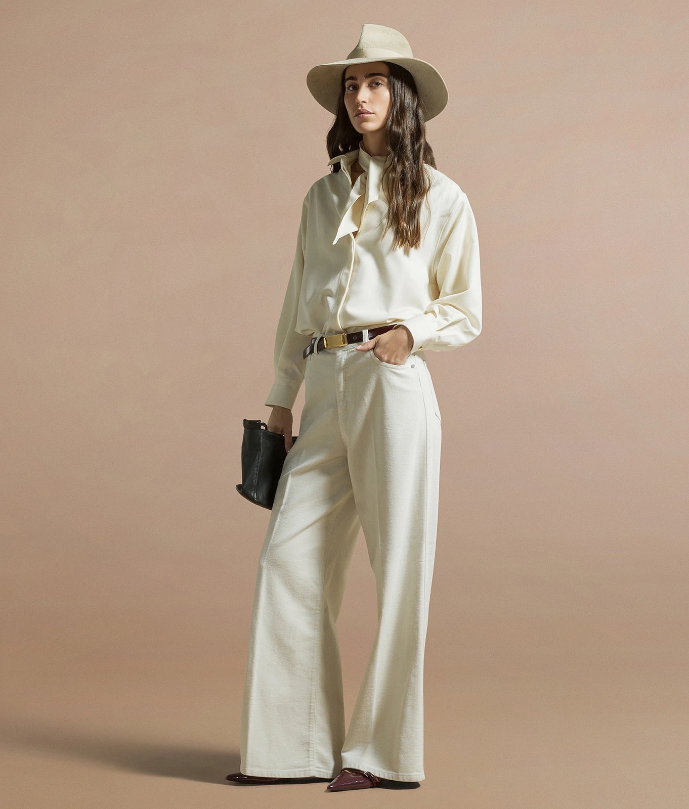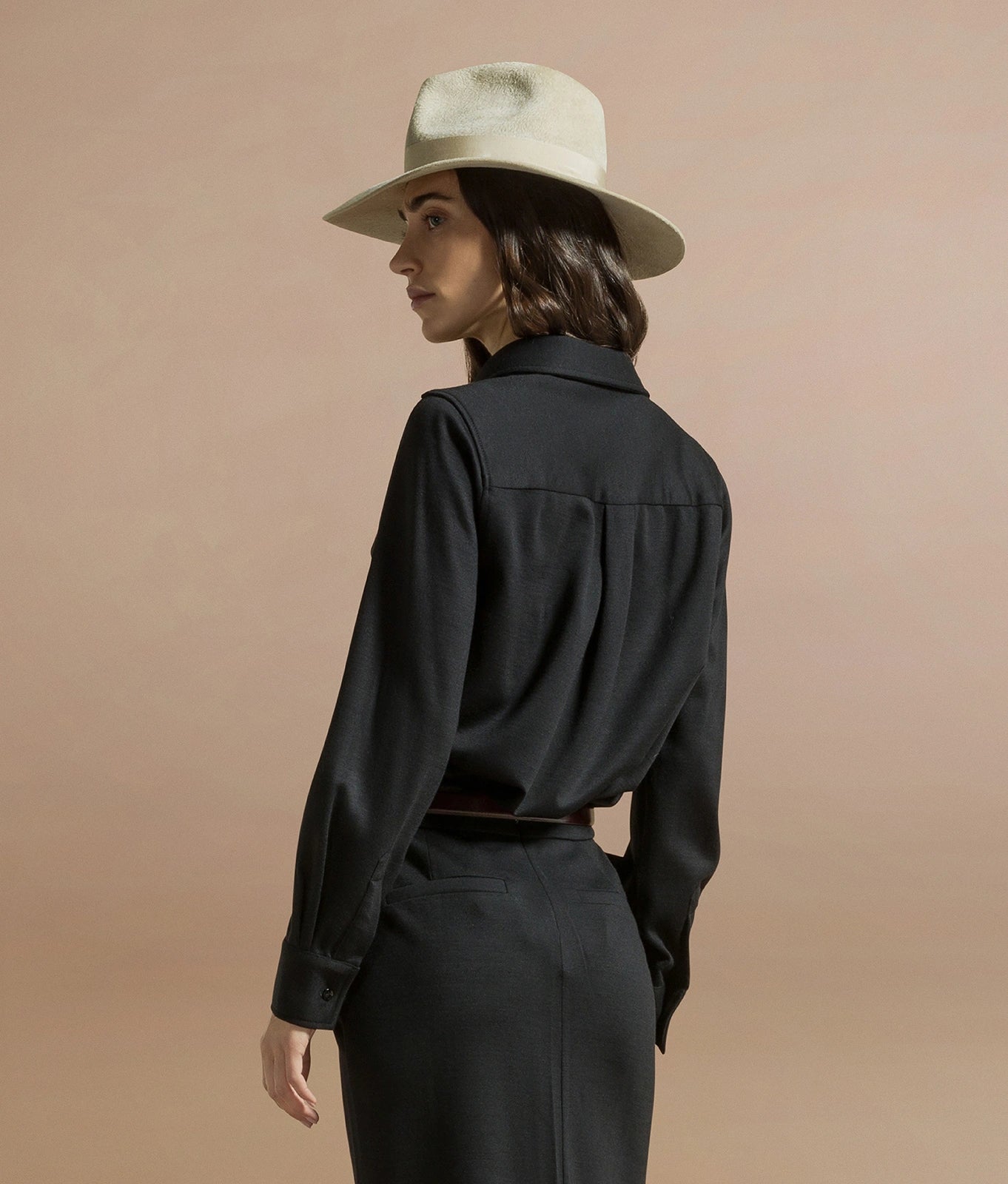 Yvonne is the oversized boyfriend fit shirt with a removable scarf and metal buttons on the collar and cuffs.