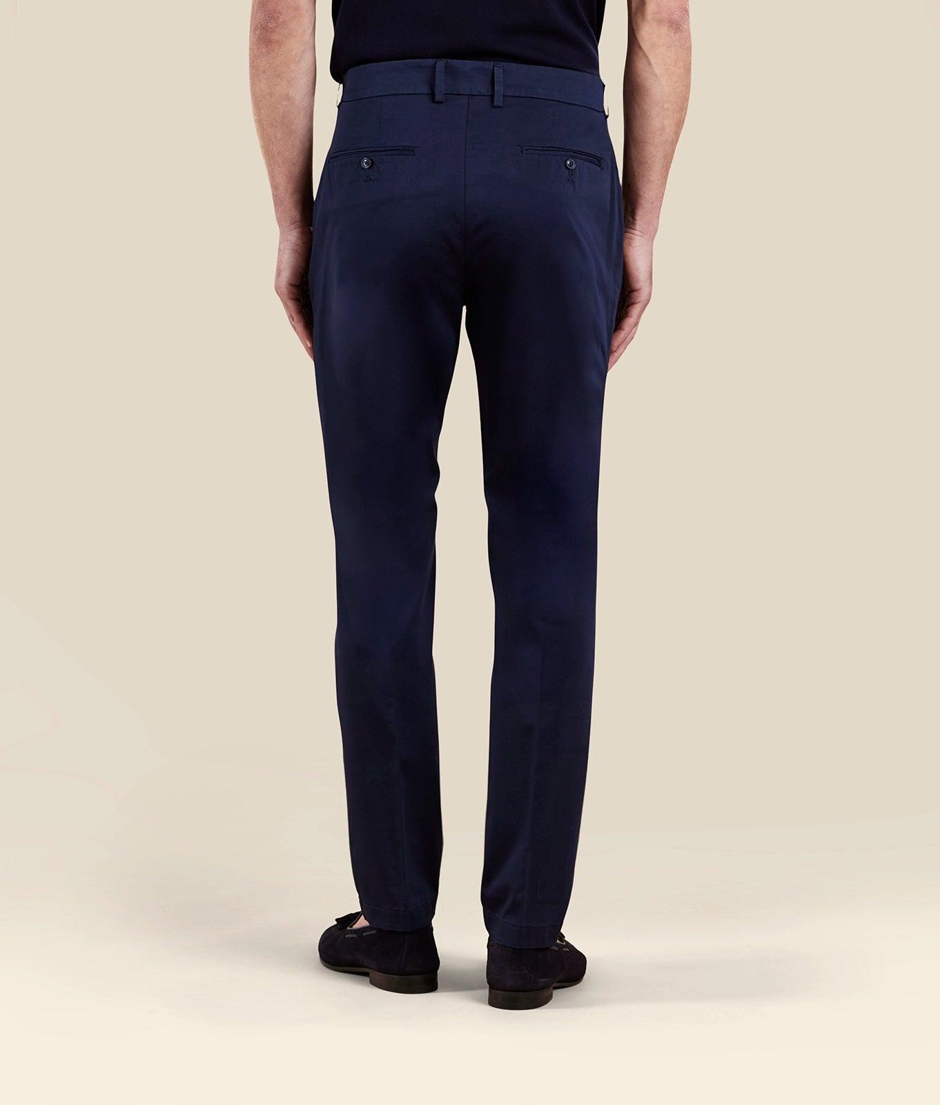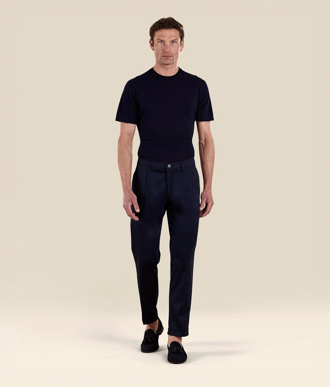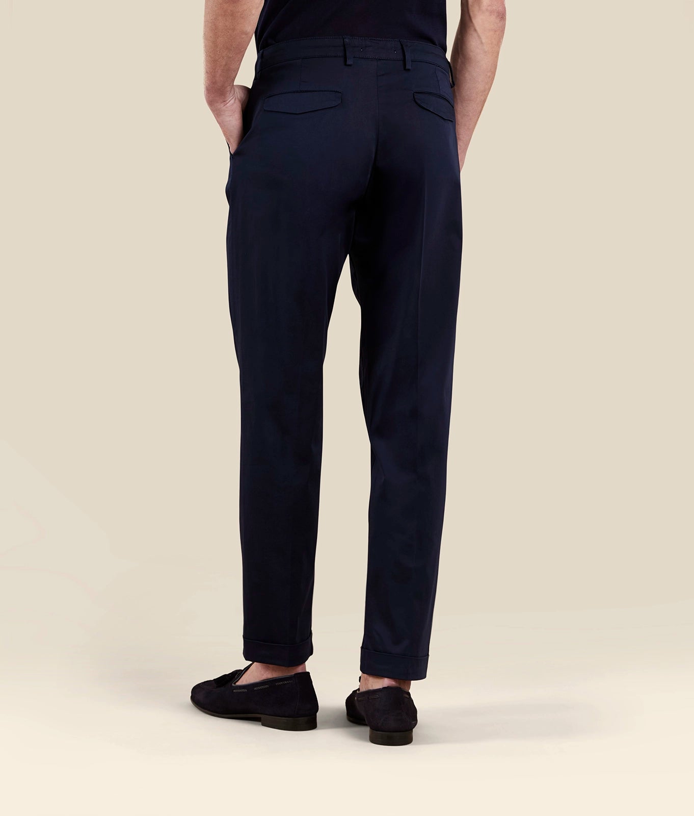 Pantaloni tapered fit con una pince in cotone stretch satinato