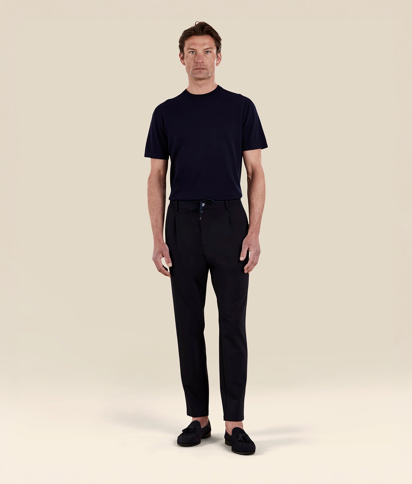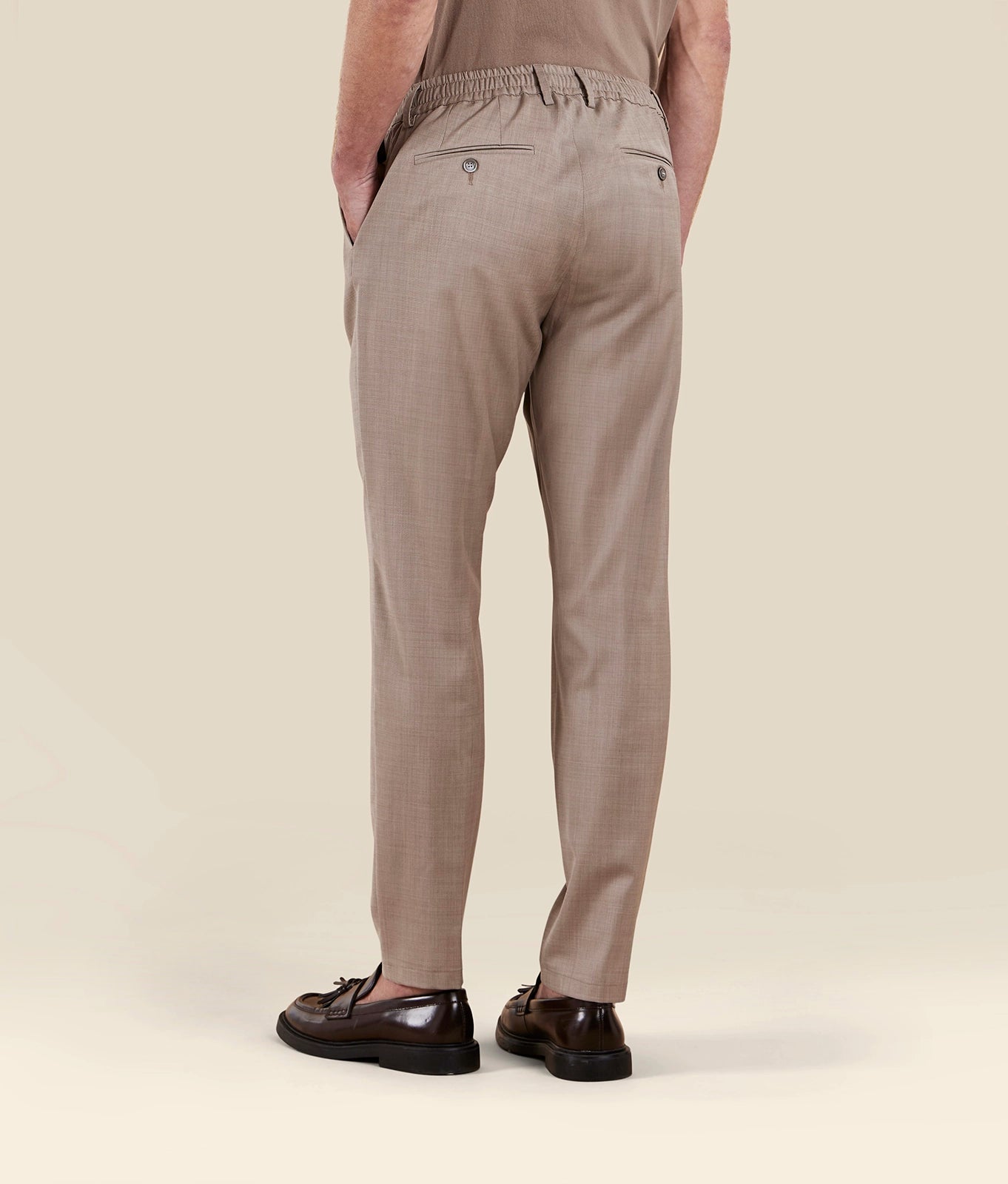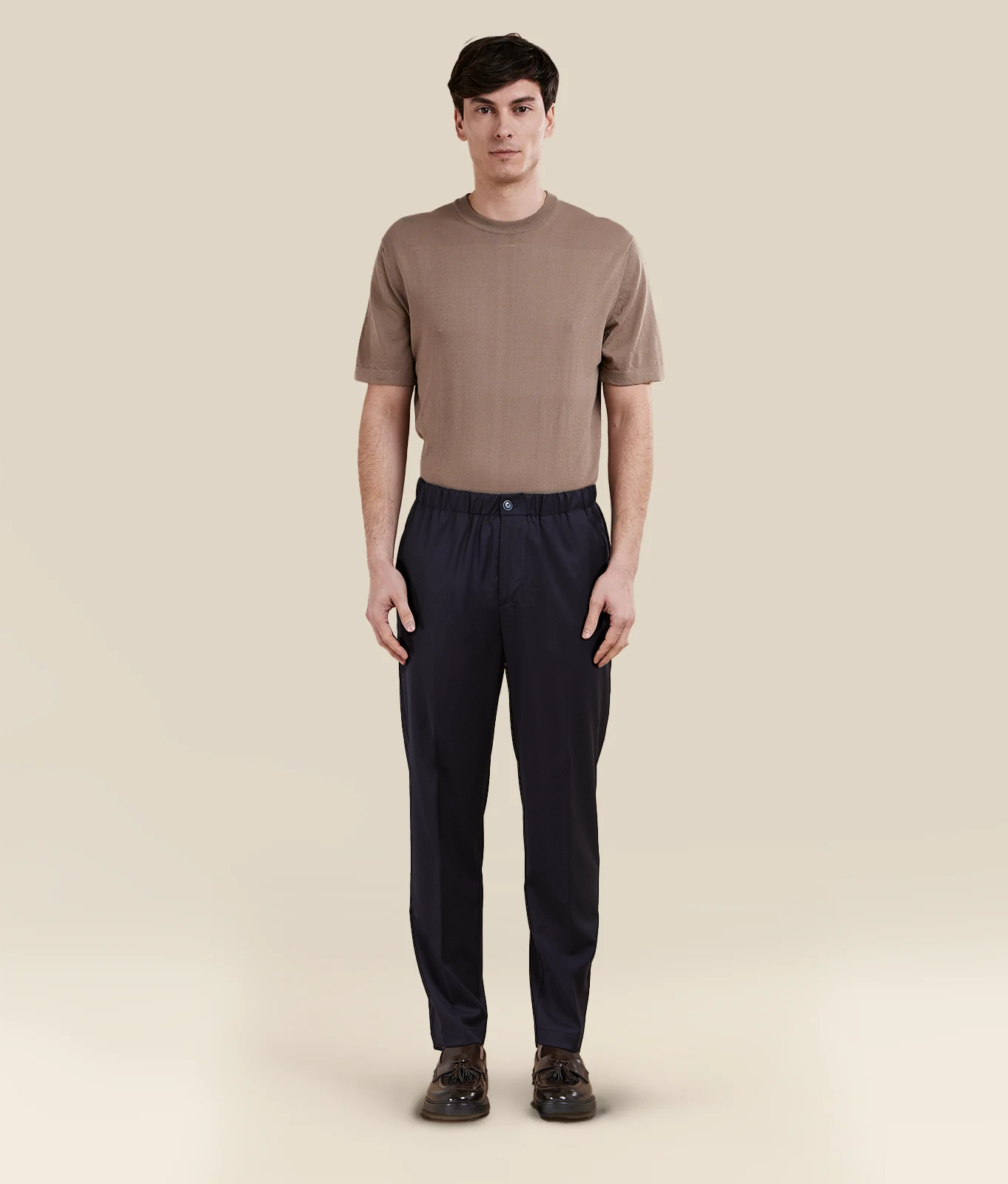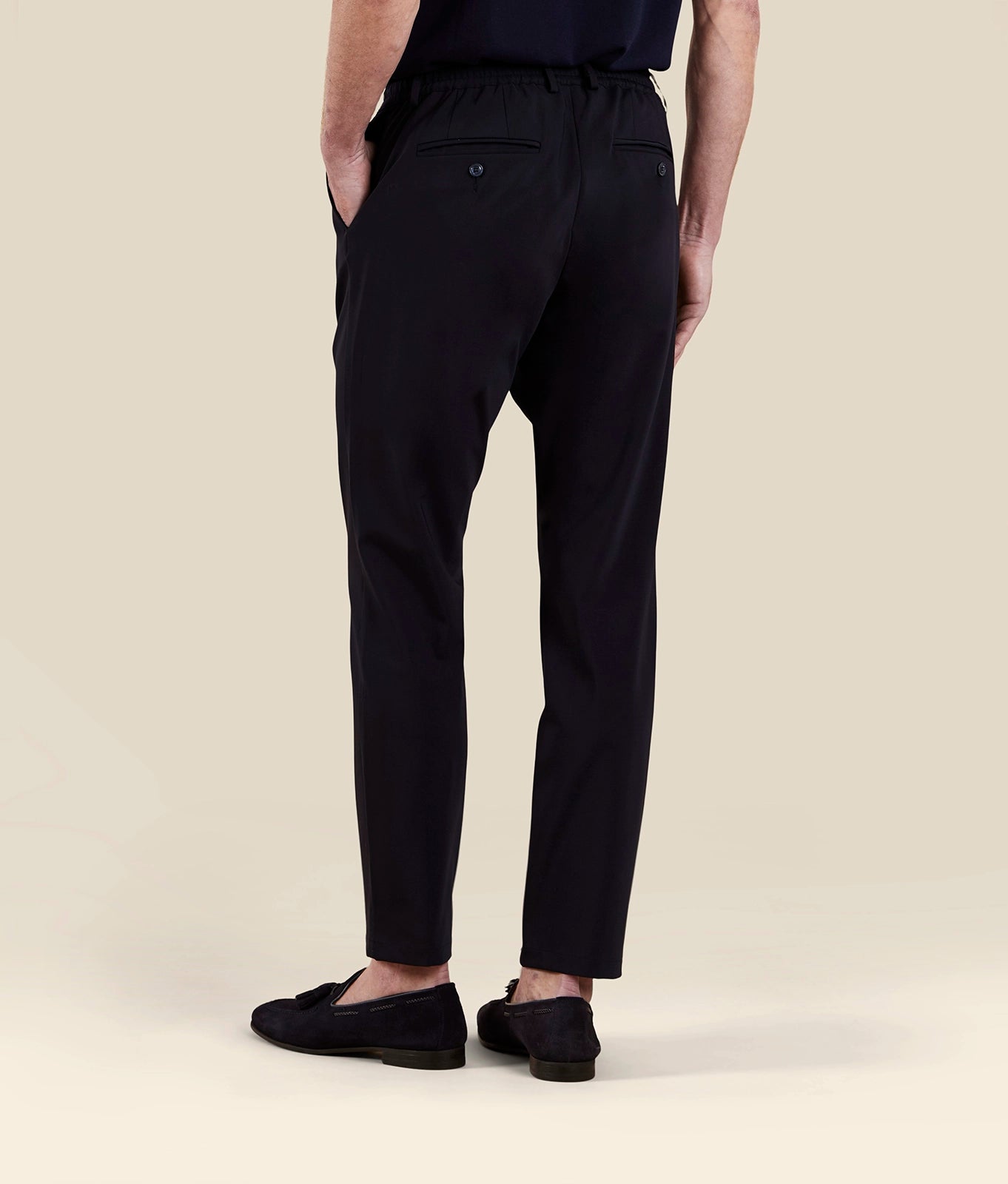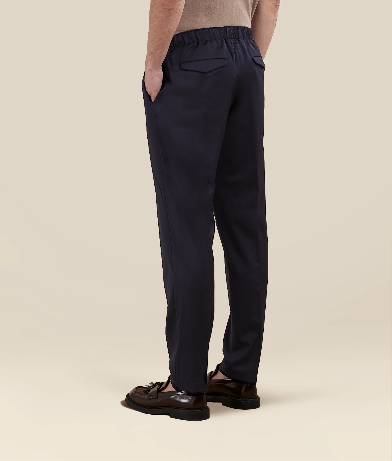 Tapered fit trousers with elasticated belt in ultra stretch virgin wool