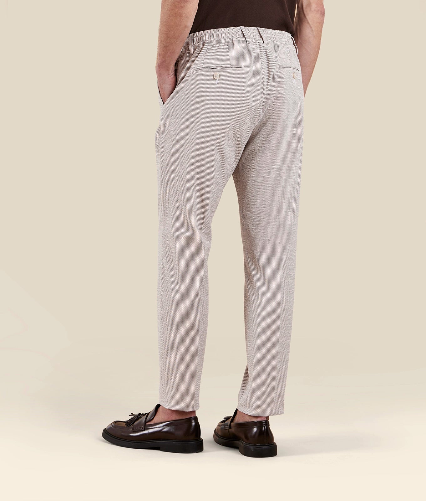 Tapered fit trousers with elasticated belt in stretch pinstriped seersucker