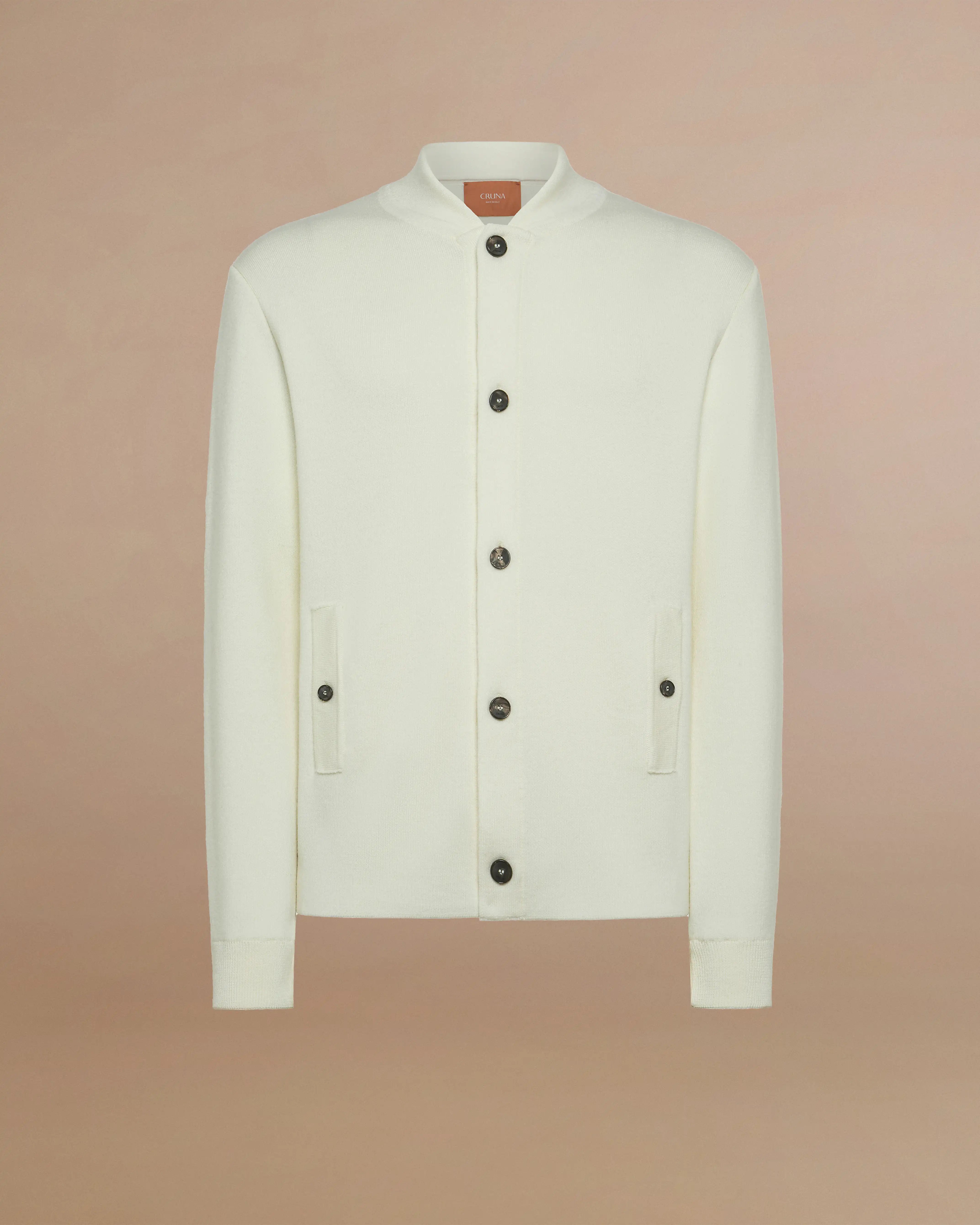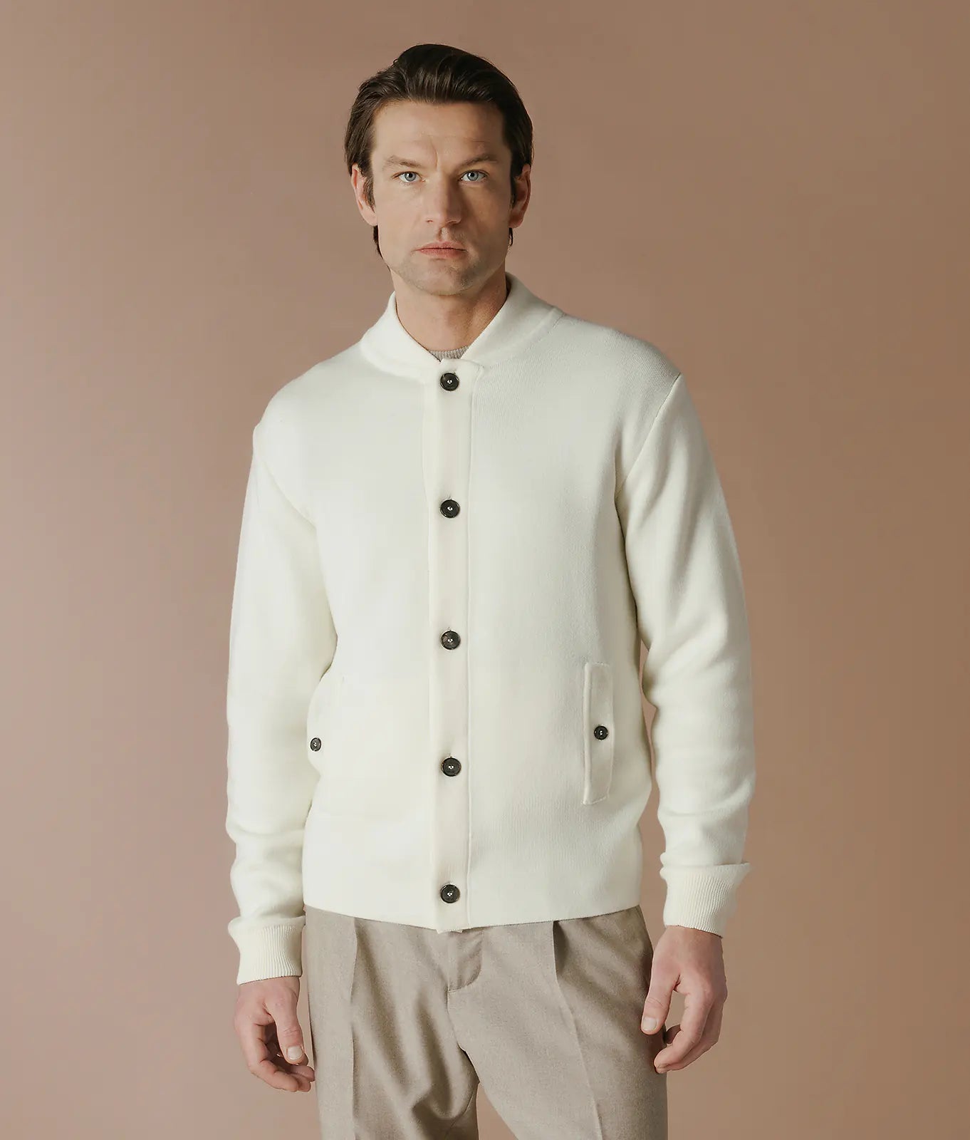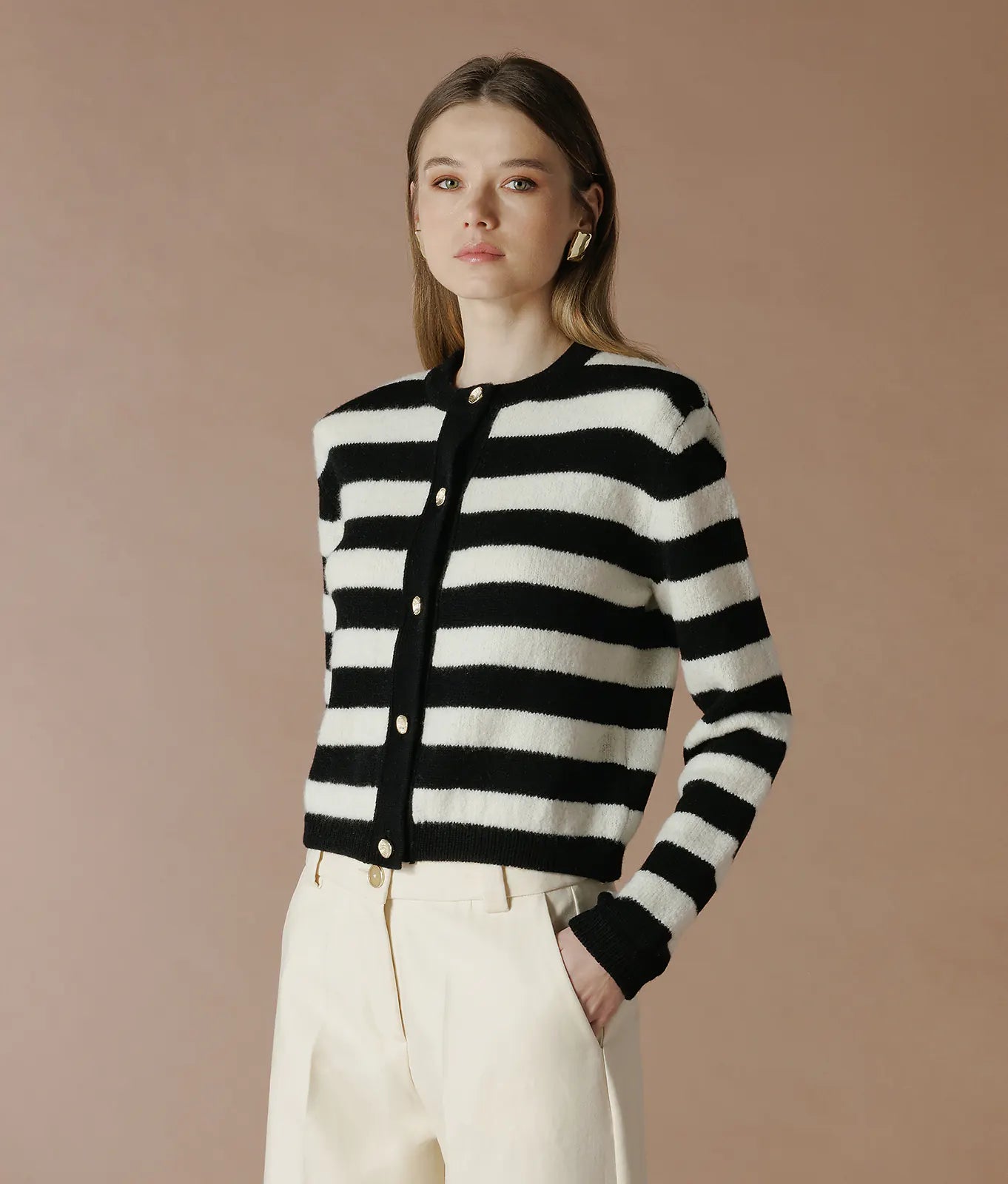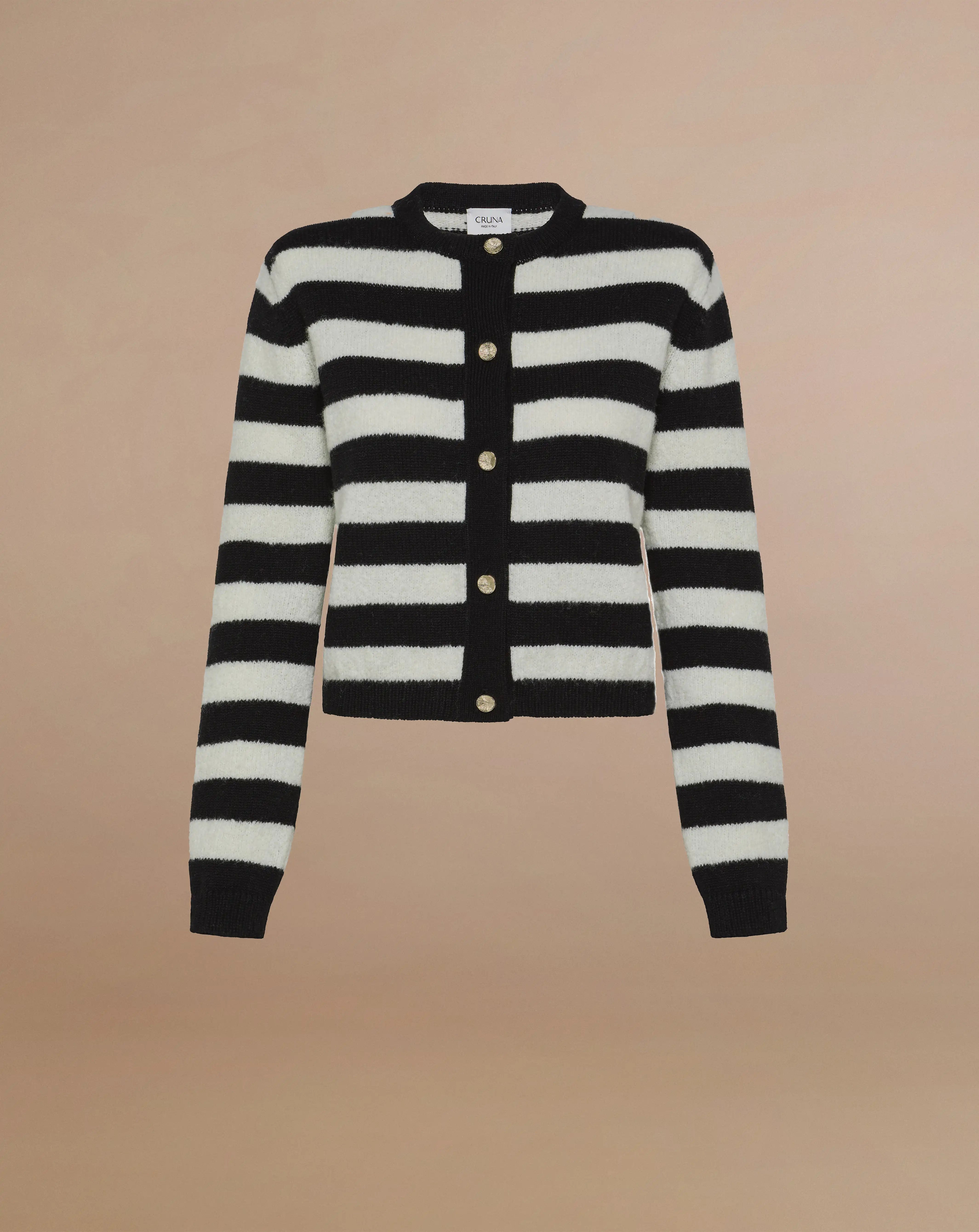 Cardigan con spalline imbottite in lana merino con riga a contrasto