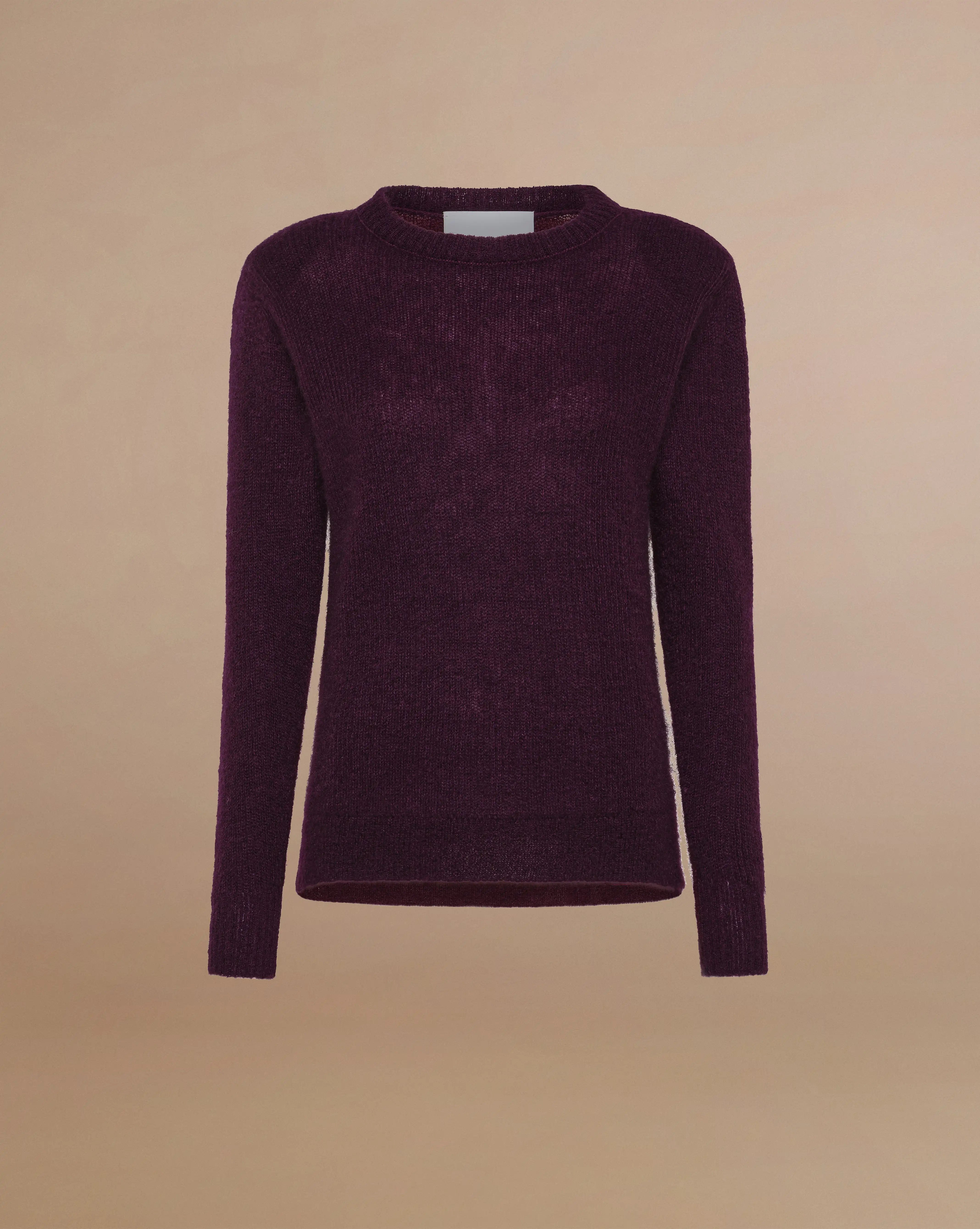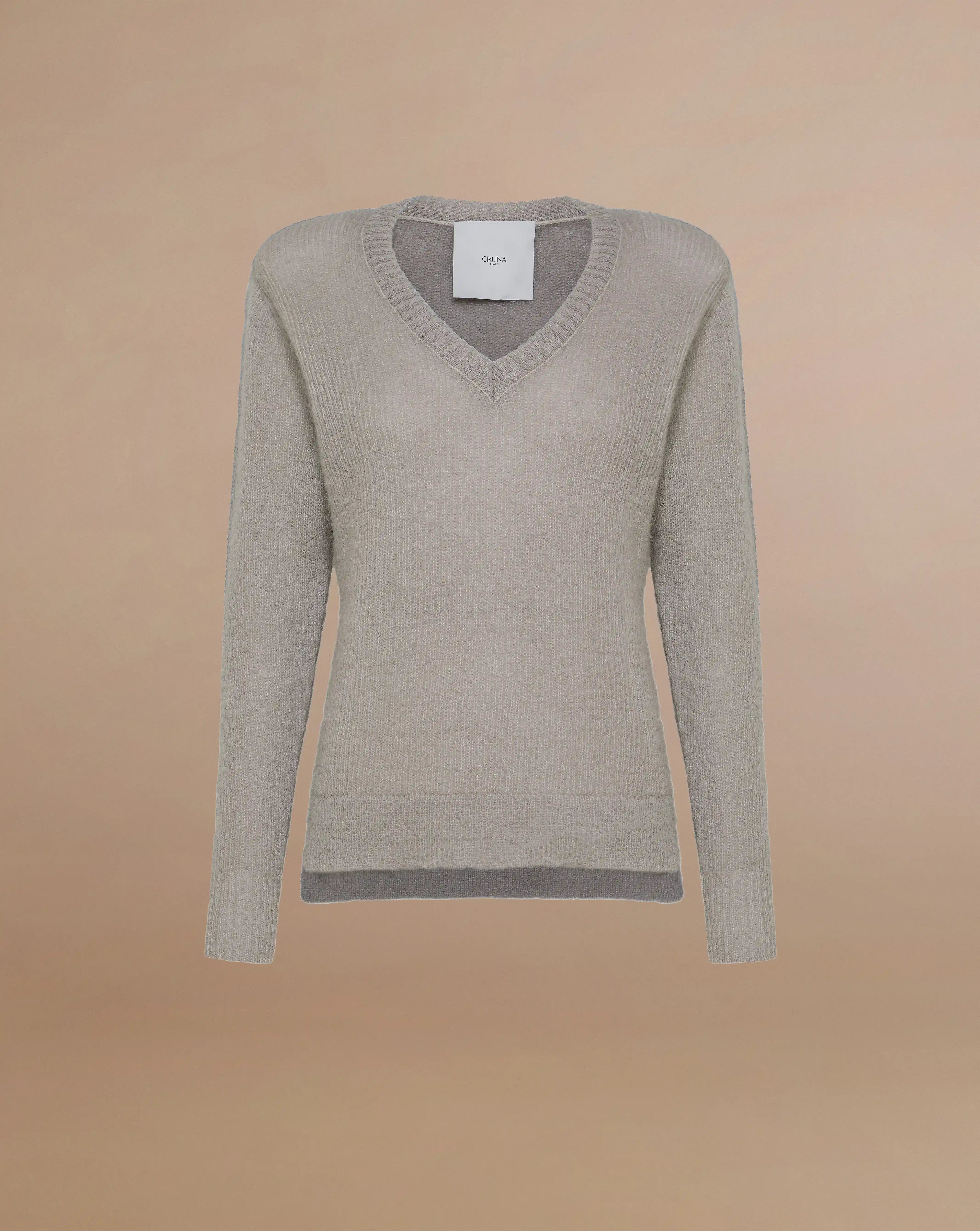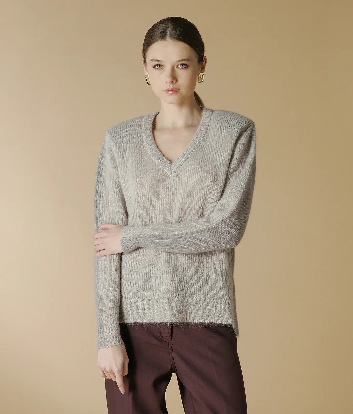 Short V-neck sweater with shoulder pads in wool mohair rib