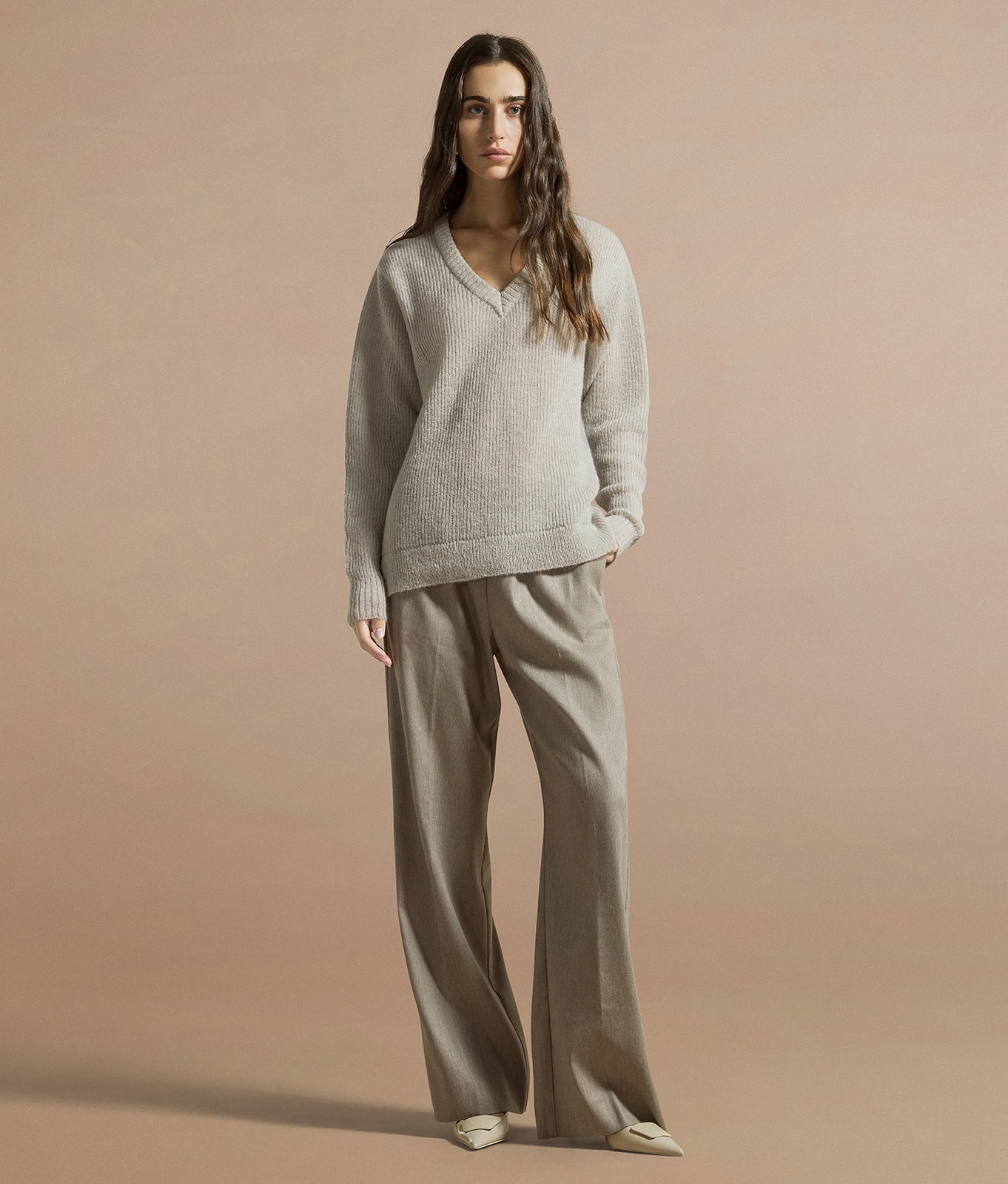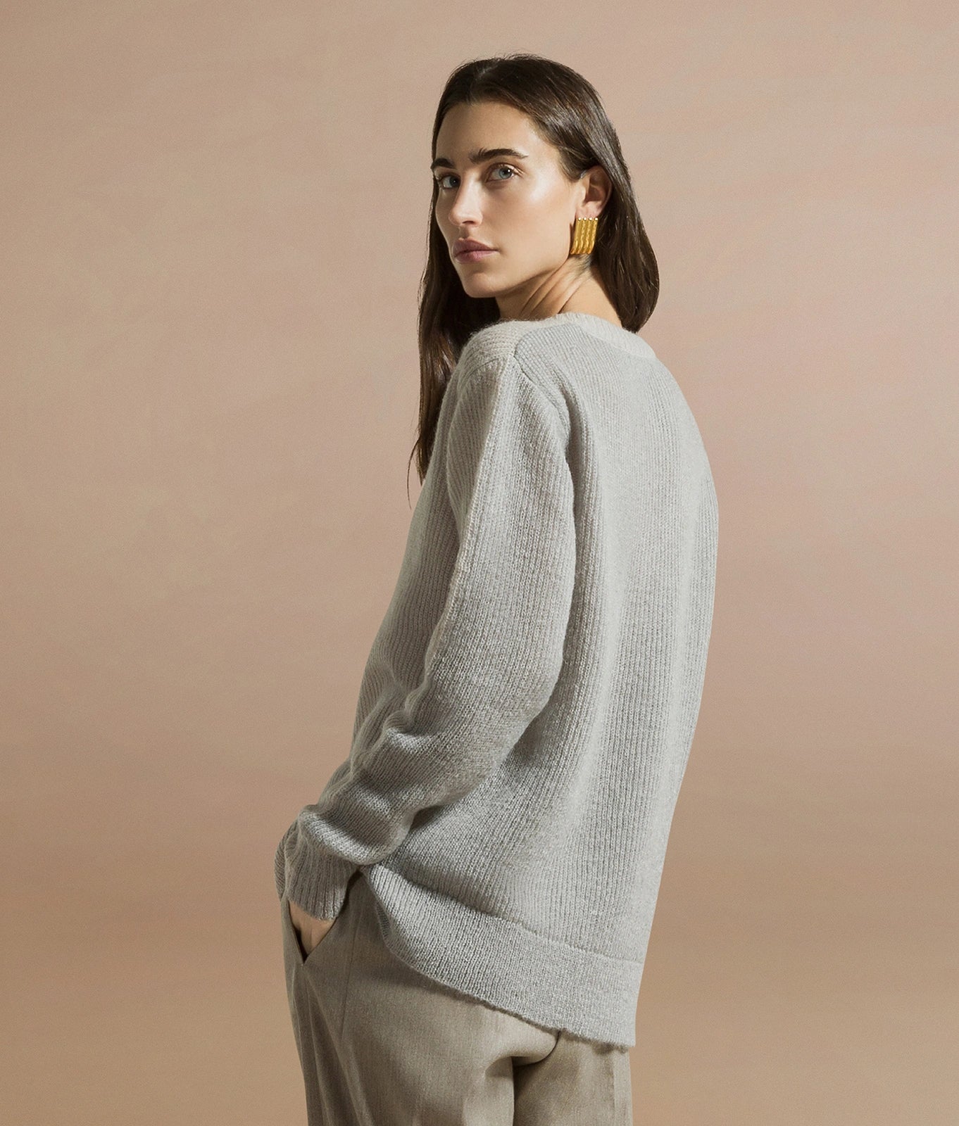 Short V-neck sweater with shoulder pads in wool mohair rib