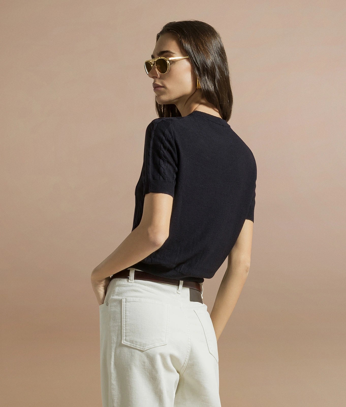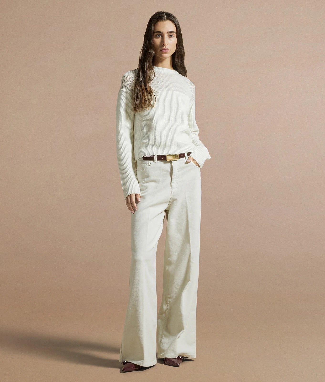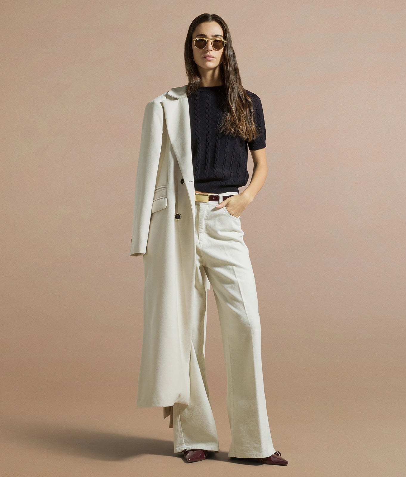 Composizione: 93%CO 7%PA - Per la pulizia del capo lavare a bassa temperatura, no candeggio, stirare a basse temperature, lavaggio a secco consentito, no tumbler. 100% Made in Italy - Tutti i capi Cruna sono creati con cura e passione dai nostri artigiani e nel rispetto del territorio e dell'ambiente. 2526