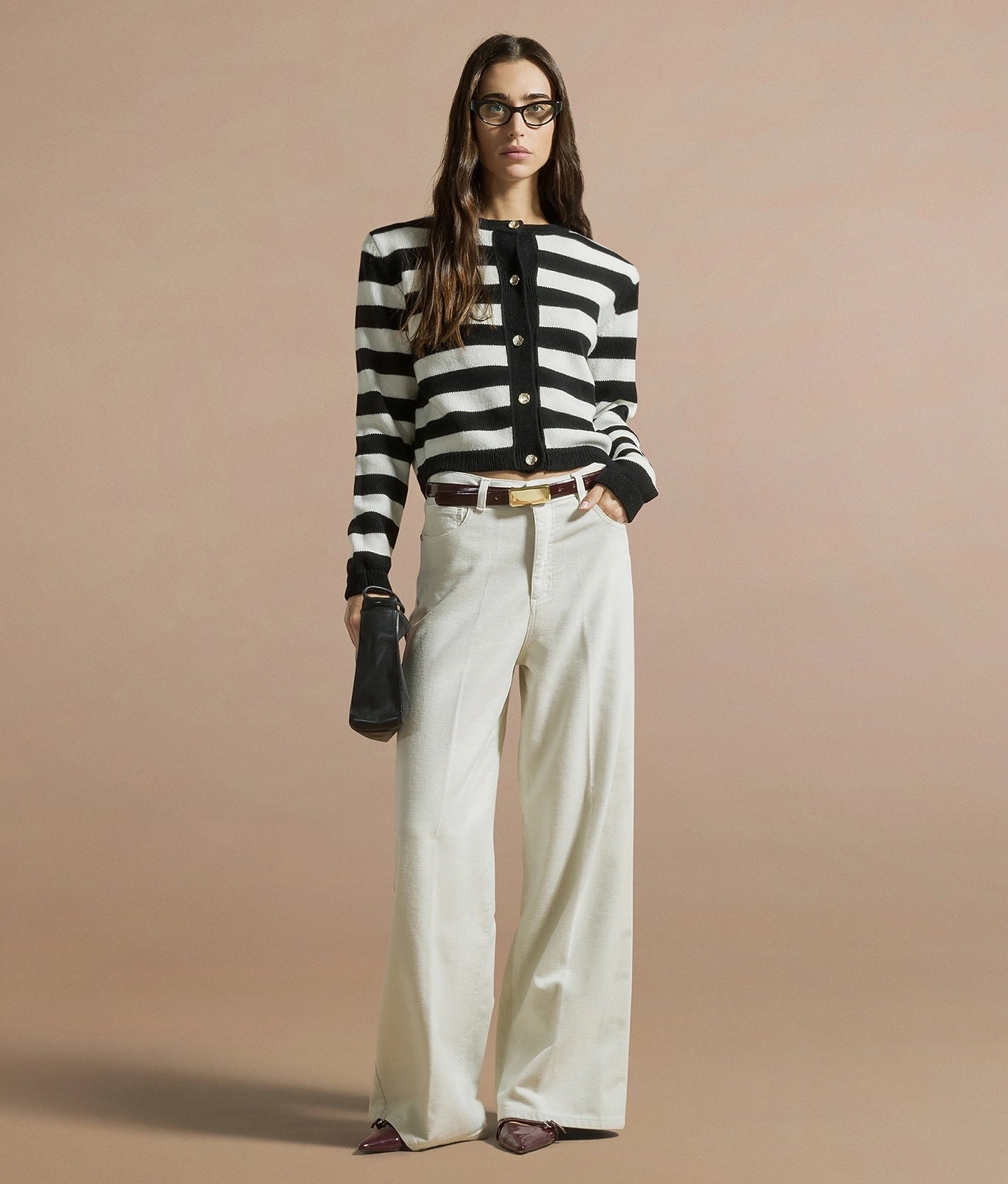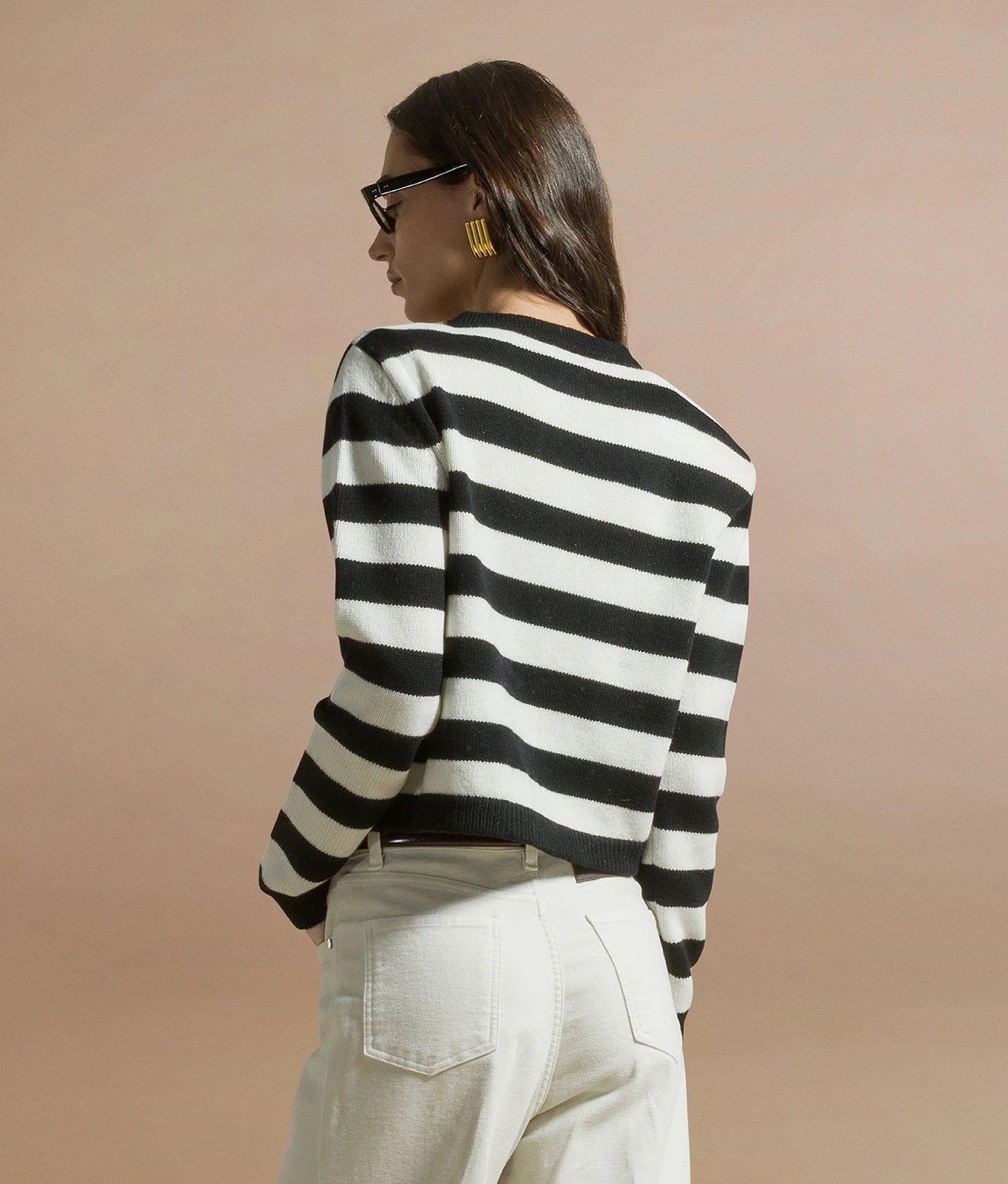 Cardigan con spalline imbottite in lana merino con riga a contrasto