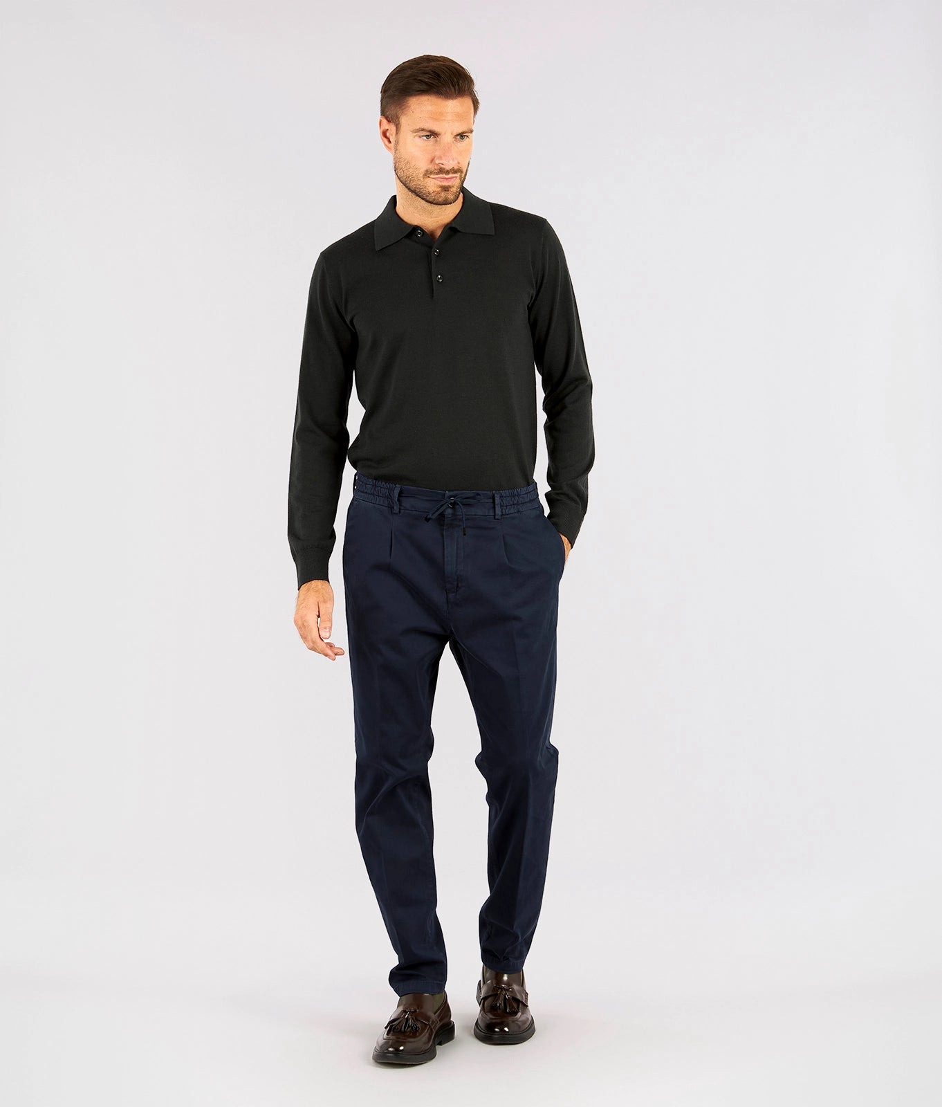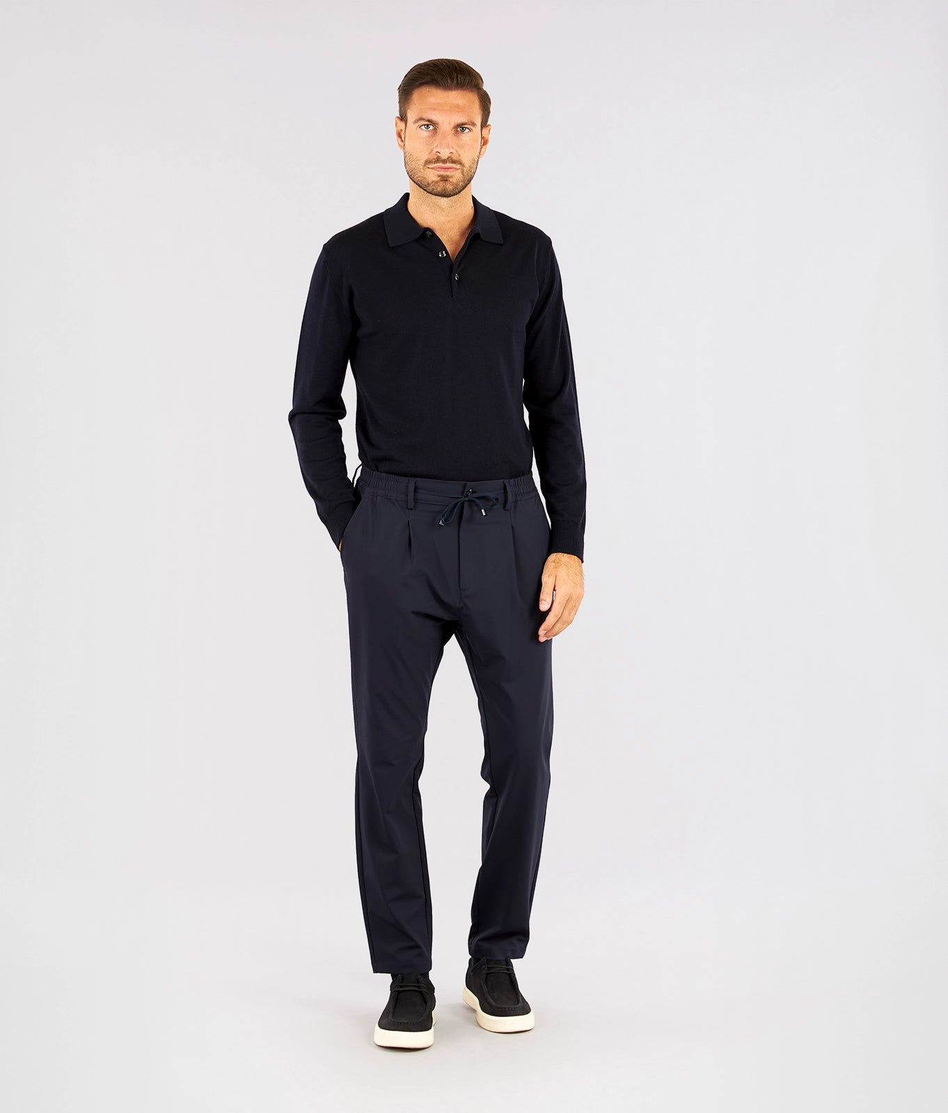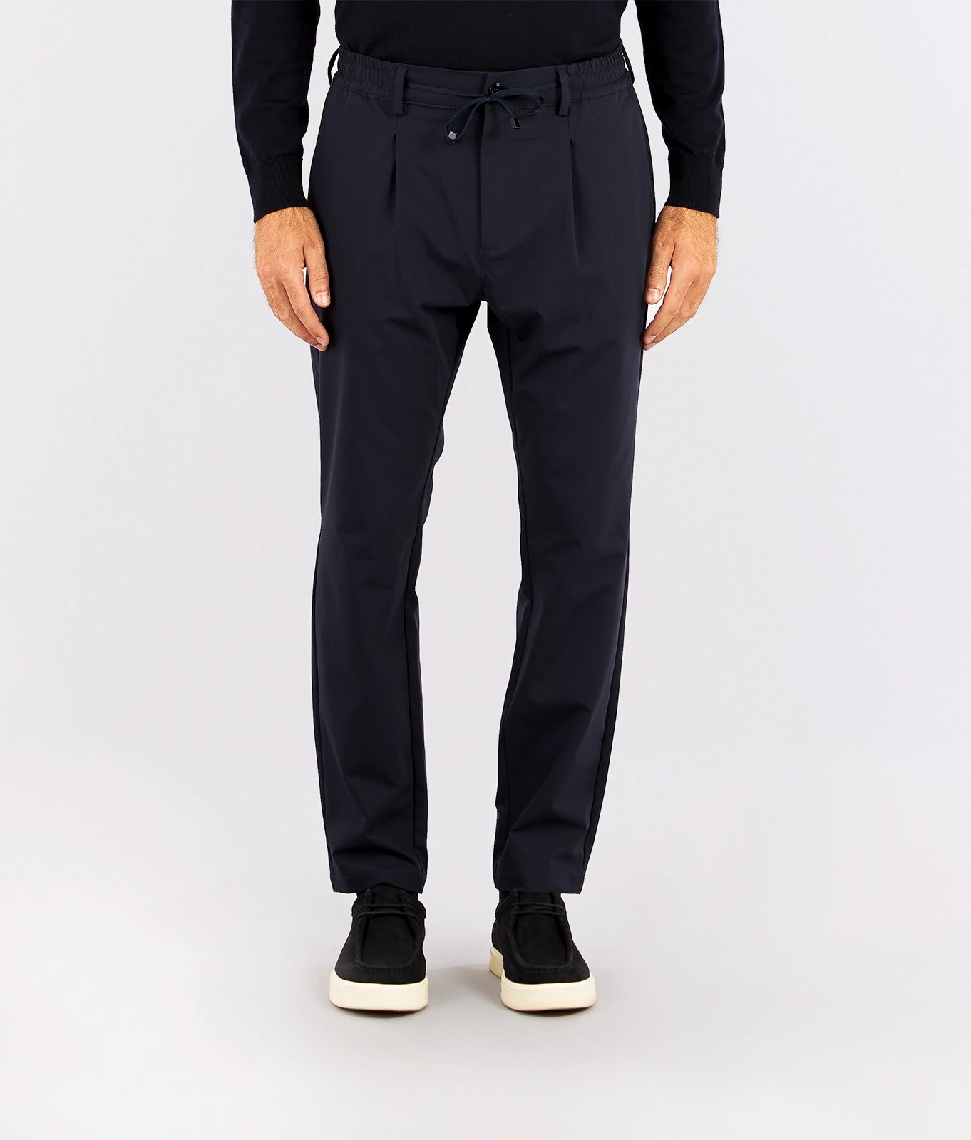 Tapered fit trousers with elasticated belt in ultra stretch virgin wool