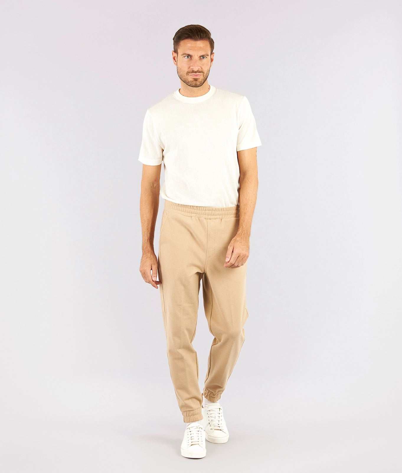 Tapered fit trousers with elasticated waist and drawstring in modal cotton and wool drill blend