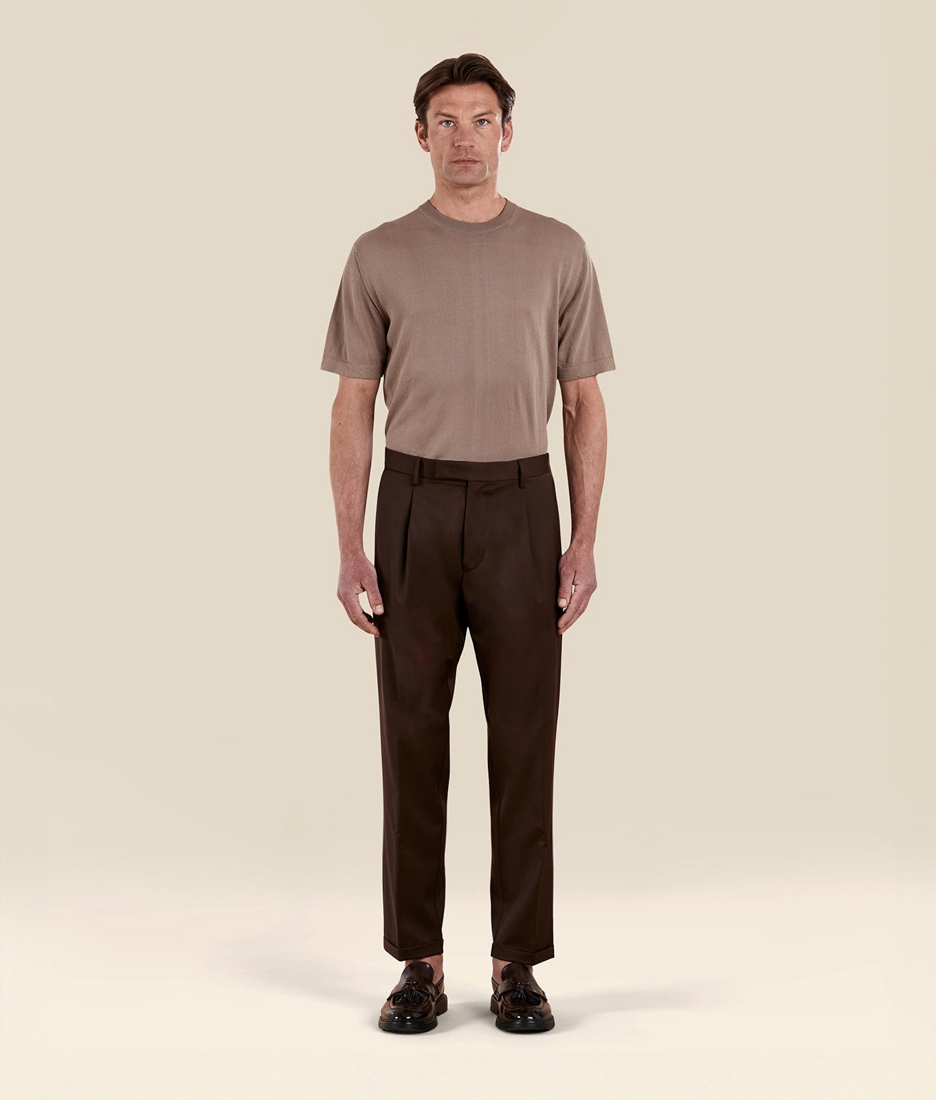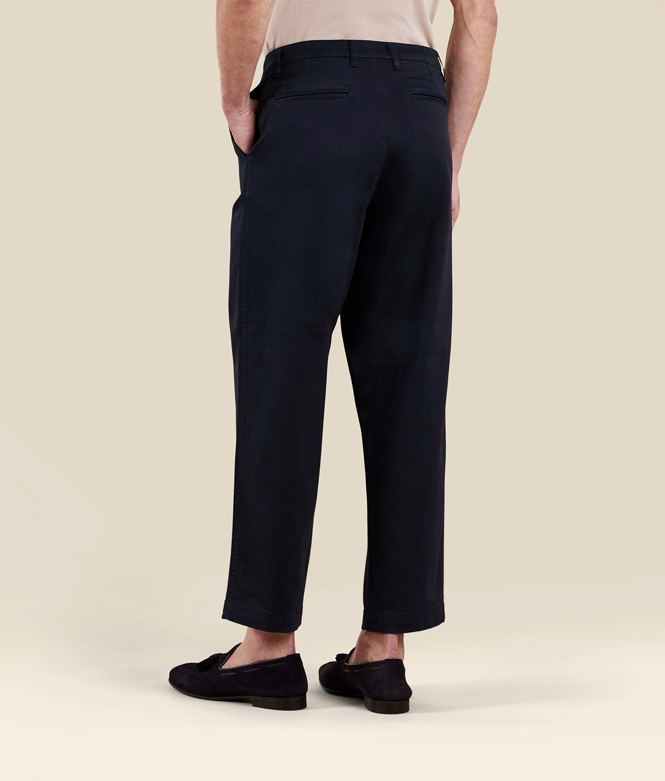 Pantaloni tapered fit con una pince in cotone stretch satinato
